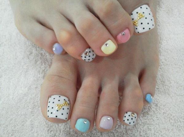 This easy design with several spring pastels features a few tiny jewelsBlue, pink green, and orange combine softly to create a simple and festive look!Just a touch of bling on your pink and purple pedi with gold glitter and jewelsPolka dots make a pastel pedi pop!