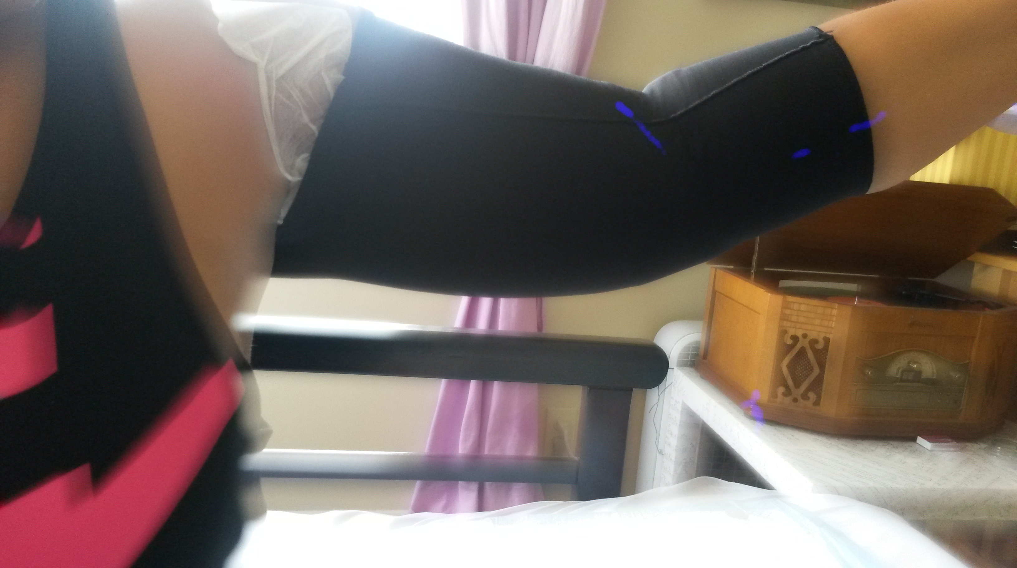 Day of surgery: I continued my antibiotics, began fasting from all food and water, and finished preparing my car and sleeping areas. You will leak some blood tinged tumescent fluid for 24-48 hours after surgery. I did a quick interview with American Health Journal (I’m not sure when it will air, but I will let you know!), then the nurses began preparing me for surgery with vitals, paperwork, and a nice little Valium pill to calm my nerves. Dr Amron then took photos of my surgical areas (calves, ankles, arms) and did his markings. I then proceeded to the operating room where the nurses used a antiseptic cleanser to again prepare my skin. Dr Amron arrived shortly after and began infusing tumescent fluid into my calves. This part was quite painful. It felt like bee stings going down my leg, but was over in a matter of minutes. Then Dr. Amron began his handiwork with a power assisted micro-cannula, while my view was shielded with a surgical sheet. I’m grateful I couldn’t see him working, it may have freaked me out more. I was able to turn to give him better angles, and it felt like a high powered massage more than anything else. There were some quite painful moments, but few and between shifting positions and it was mainly the incision sites. I did get quite a bit of anxiety for which Dr. Amron had the nurse provide me a mild sedative in my IV tap. I then was calm enough for Dr. Amron to continue removing the diseased fat. I had three incisions at each knee, three at each ankle, one at each elbow, and one at each armpit. These healed quickly and are hardly noticeable!