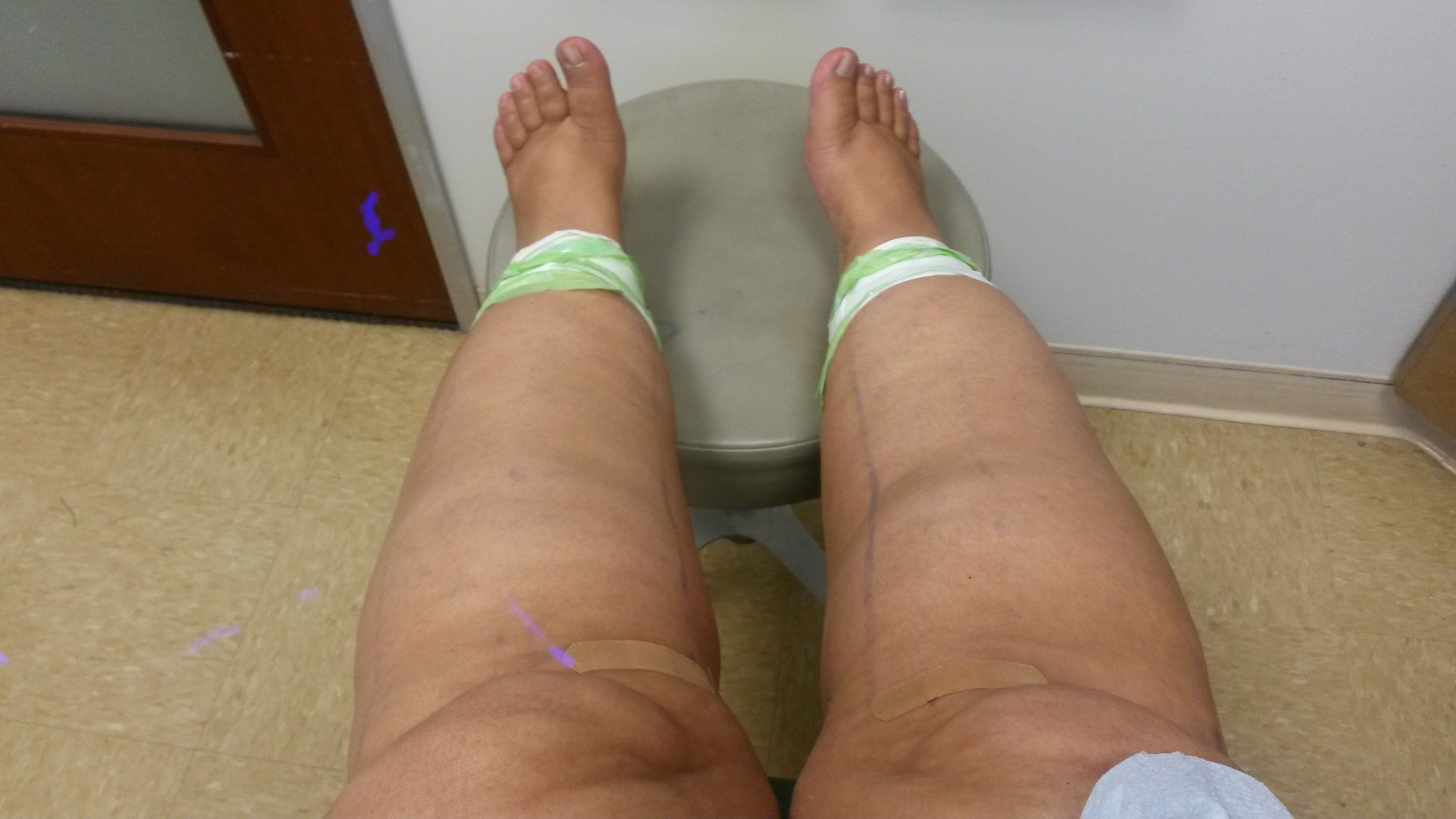 Day one – Lipedema calves, post-op at Dr. Amron’s office. Very swollen!