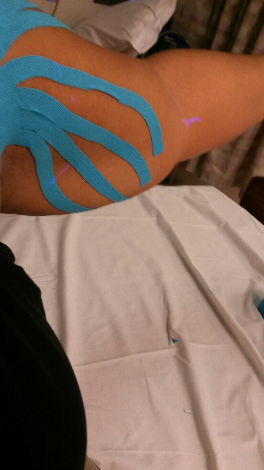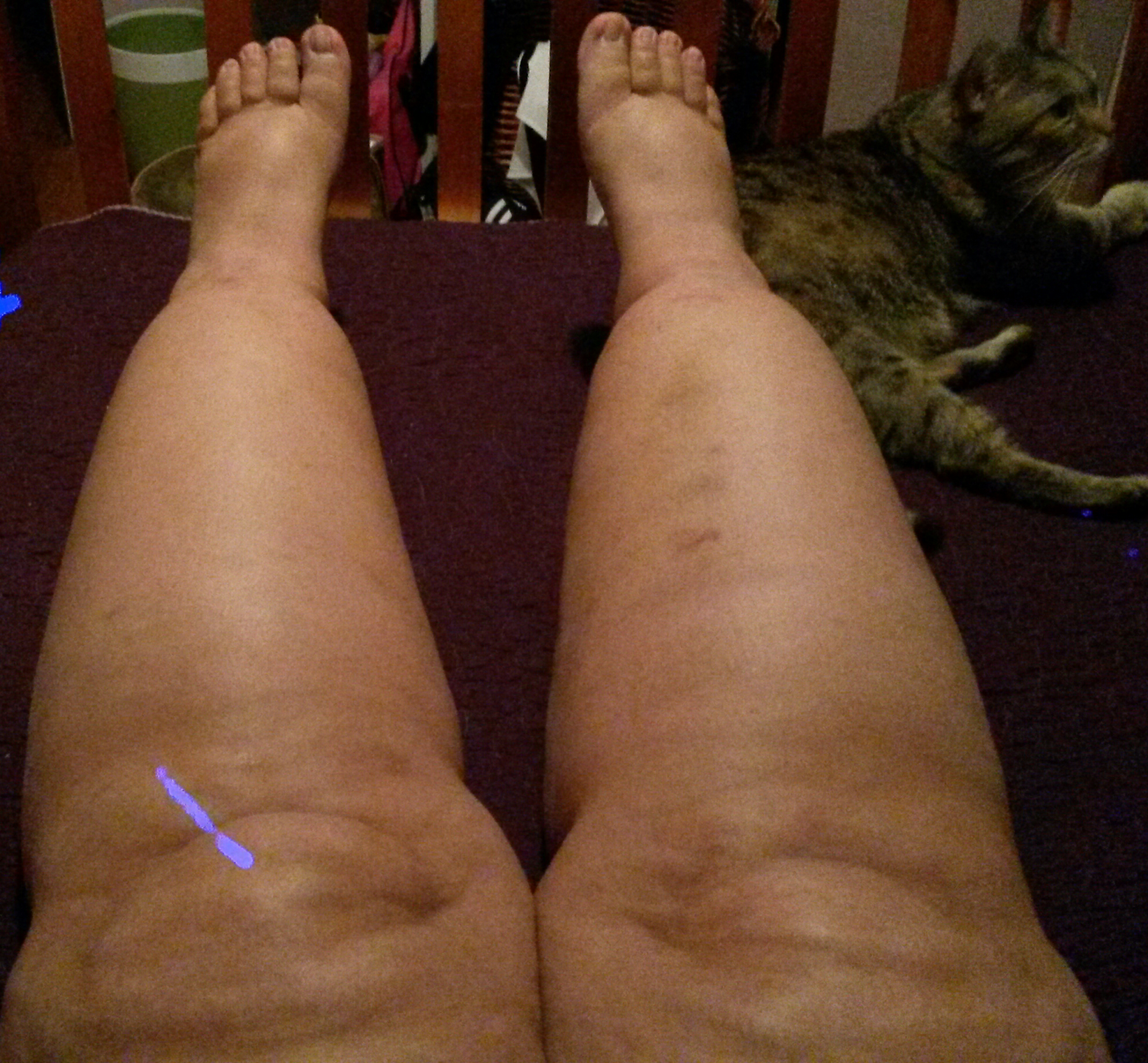 I just wanted to share a few photos of my recovery process. I’m feeling good and very mobile, but it has been a lot of work. I have stage 3 Lipo-lymphedema. I have been attending physical therapy twice weekly, and taking my supplements. It involves complete decongestive therapy, which involves MLD massage, compression bandaging, skin care, and measuring of my affected limbs. I have also tried the Graston technique of soft tissue mobilization and kinesio taping. The swelling is subsiding well but I am still trying to clear my body of residual hematomas (deep bruising/excess blood cell waste) in the treated areas. Many thanks again to my lymphedema therapist and physical therapist, Val Hunter, PT CHT from the Providence St. Joseph Occupational Health Center.